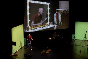On stage: David Collins and Shane Dundas. Under the screen: Doug Bayne, summoning explosions, glitches, and glorious nonsense in real time.